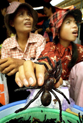Duas mulheres tentam atrair clientes para comprar aranhas grelhadas gigantes, um prato muito popular na Cambodja, estas aranhas são comidas como lanche a qualquer hora do dia.